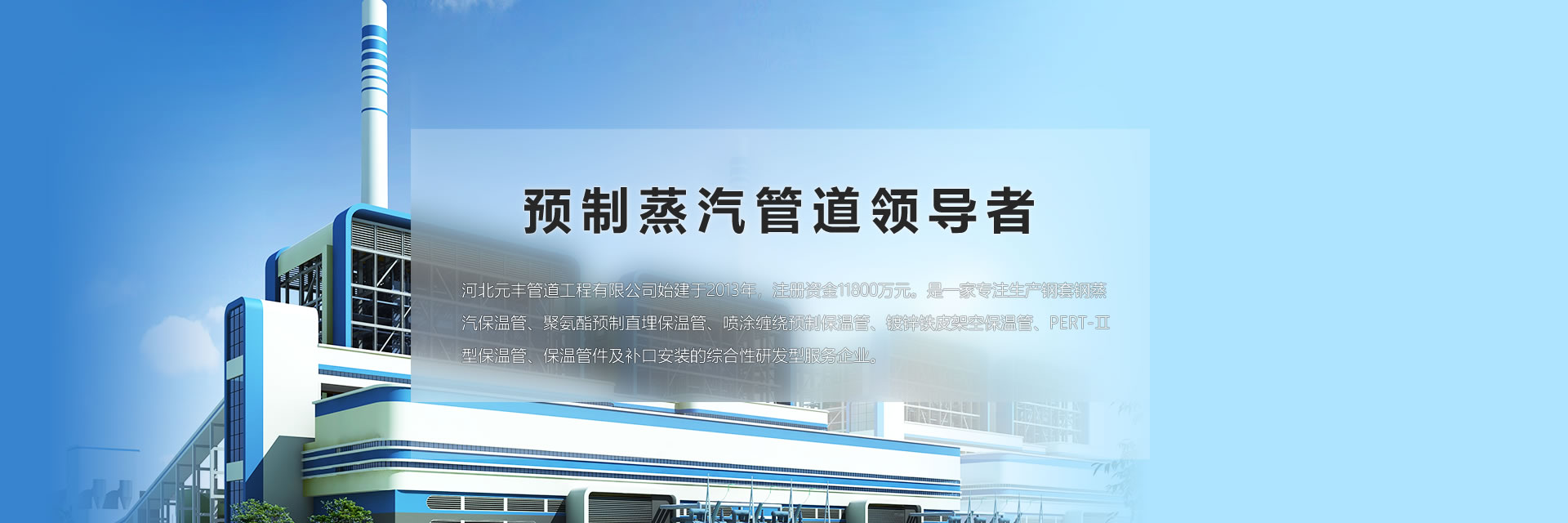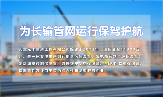 河北元豐管道工程有限公司始建于2013年,注冊資金11800萬元。是一家專注生產鋼套鋼蒸汽保溫管、聚氨酯預制直埋保溫管、噴涂纏繞預制保溫管、鍍鋅鐵皮架空保溫管、PERT-Ⅱ型保溫管、保溫管件及補口安裝的綜合性研發(fā)型服務企業。